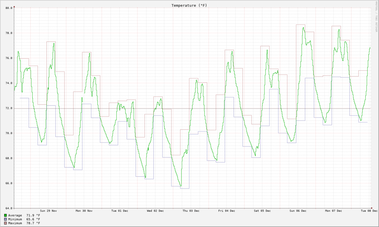 This code will create the RRD database file if it doesn’t already exist and insert data into it. In my actual code, this is reading from a serial port connected to a QTPy which is connected to a number of sensors (including a temperature sensor). Once per second, that microcontroller reads the sensors and reports the data over the serial port. This application picks up that data and shoves it into the RRD database.
